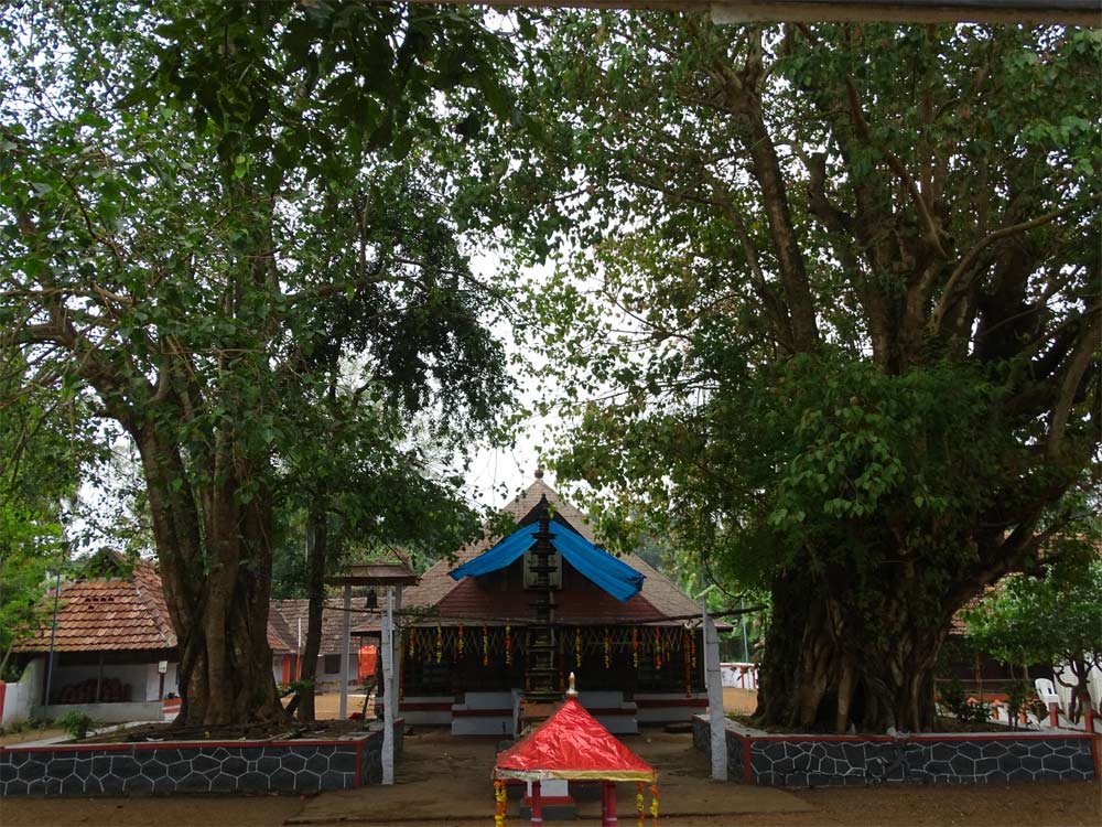 Two beautiful mighty Banyan trees adorn the temple right in the front on either side of the poomukham. A huge traditional ‘kamba lamp’ is placed in the middle of the two Banyan trees in alignment with the main deity of Goddess Bhadrakali.